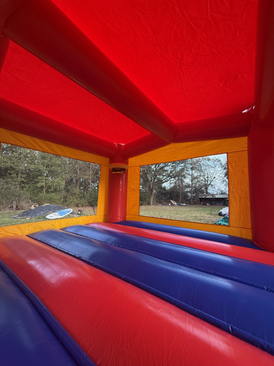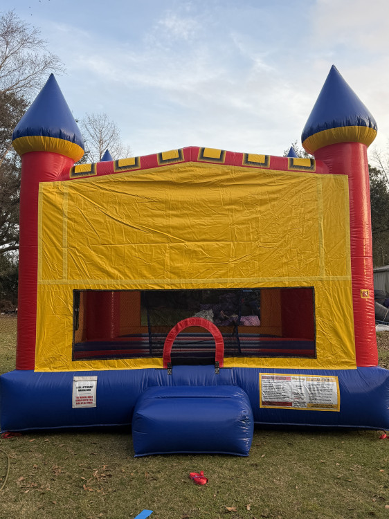 A colorful 15 ft x 15 ft castle-style bounce house with tall turret corners, mesh windows for visibility and airflow, and an attached basketball hoop for extra fun. The roomy interior features wide, cushioned bounce lanes and a low step entrance for easy access. Optional themed front panels are available—call the office to request a specific theme. Safe, bright, and built for big-group bouncing at birthday parties, school events, or backyard celebrations.